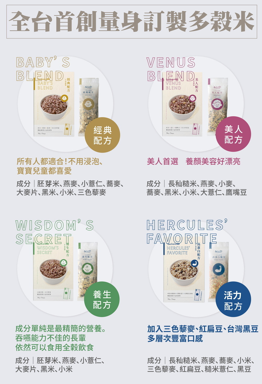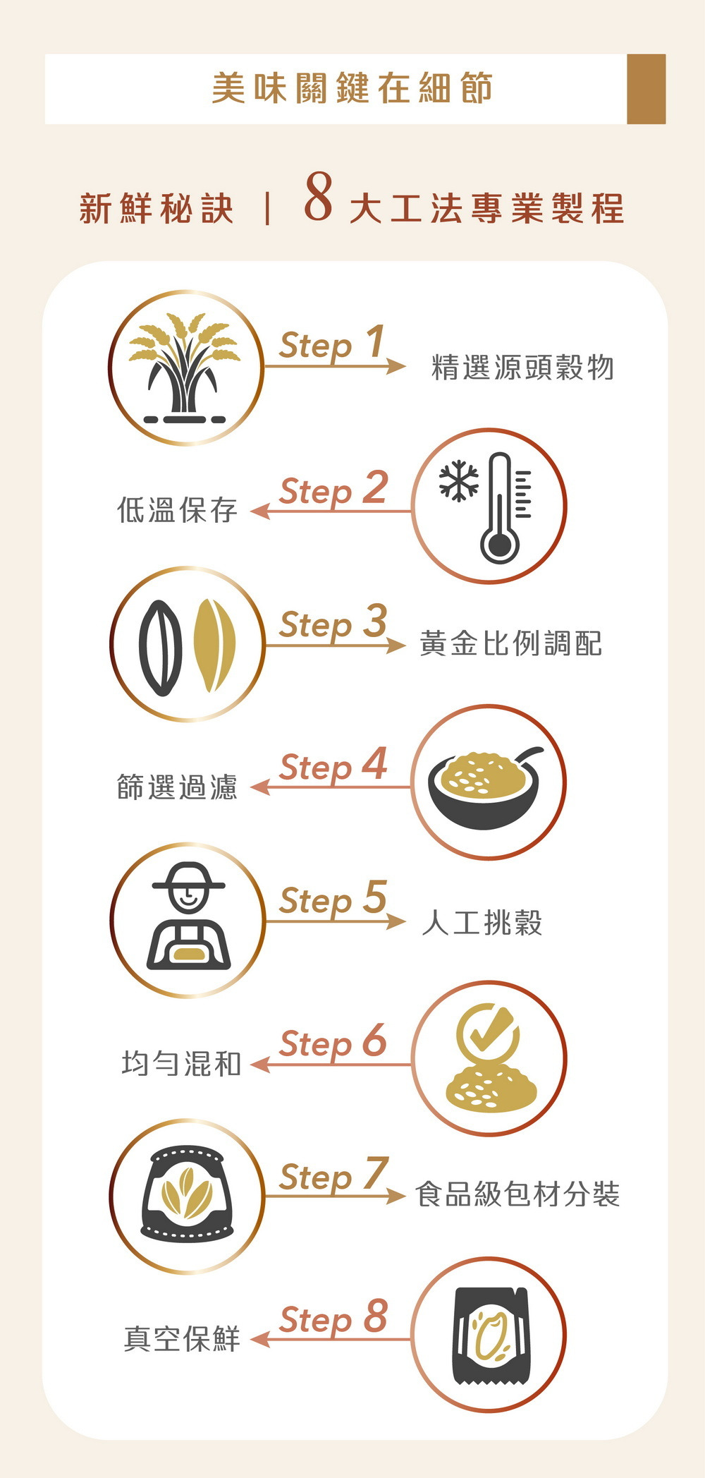 成分及原產地:長秈糙米(台灣)、燕麥(智利)、小麥(台灣)、蕎麥(台灣)、黑米(台灣)、小米(烏克蘭)、大薏仁(寮國)、鷹嘴豆(美國)
