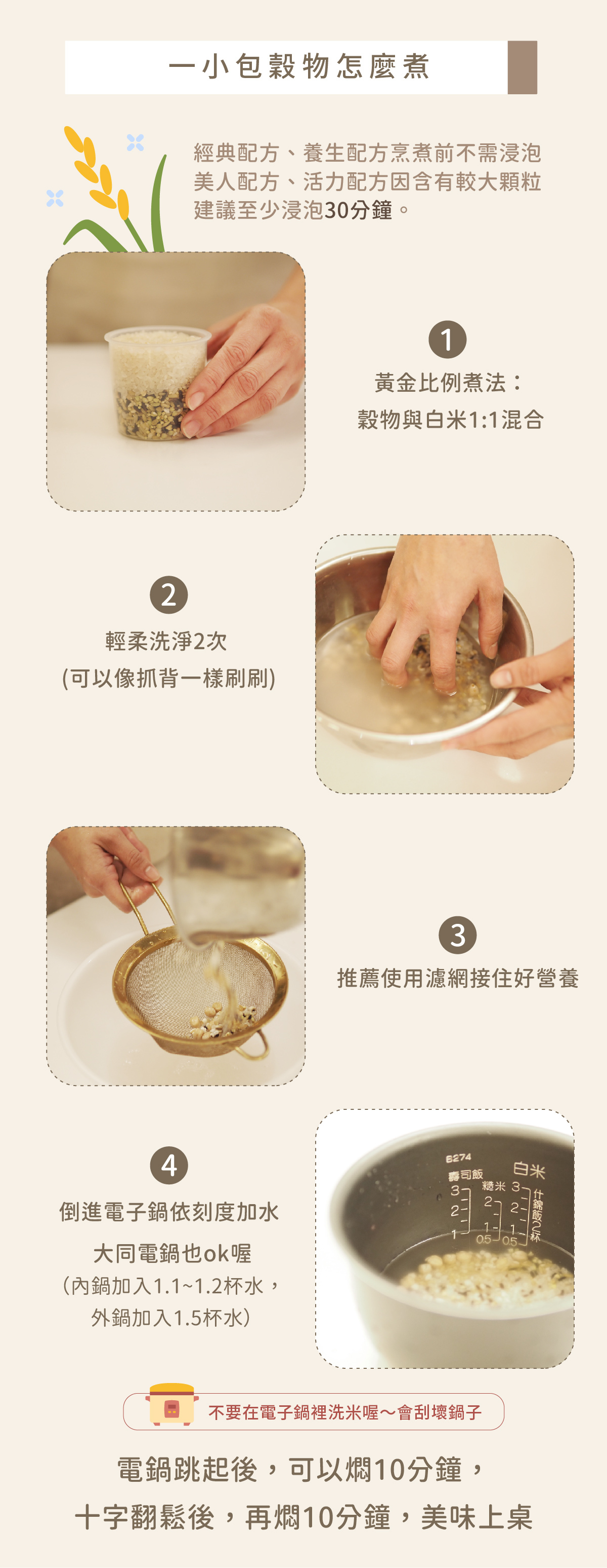 成分:長秈糙米、燕麥、小麥、蕎麥、大薏仁、黑米、小米、鷹嘴豆