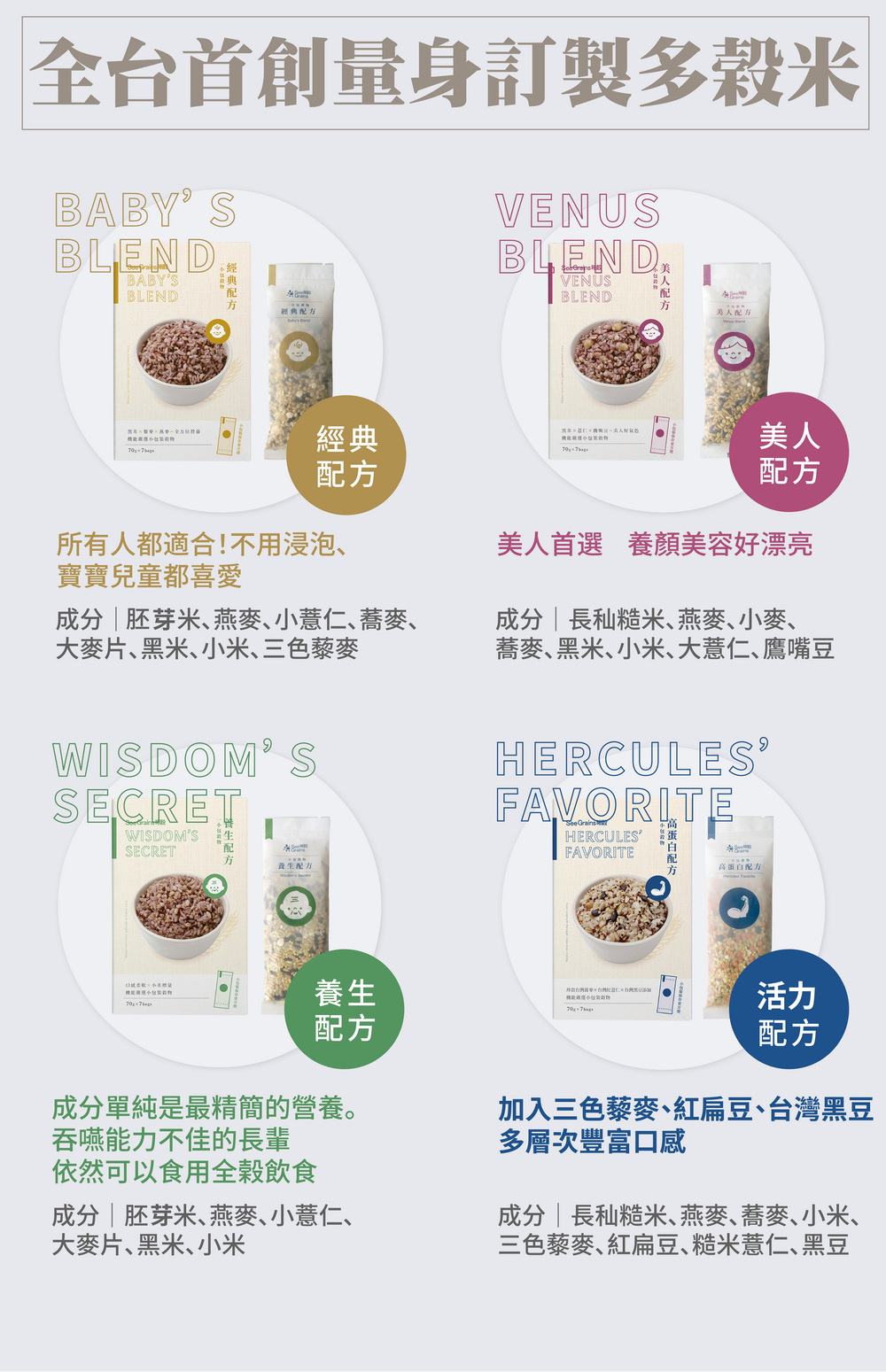 成分及原產地:胚芽米(台灣)、燕麥(智利)、大麥仁(台灣)、大麥片(澳洲)、黑米(台灣)、小米(中國)